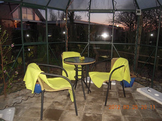 Vi har et drivhus der står stik nord/syd, med indgangen vendende mod syd, og af hensyn til specielt tomatplanterne, burde vi kalke gavlen og døren. Men jeg kan altså slet få mig selv til at gøre det, fordi det ville ødelægge halvdelen af fornøjelsen ved at "stige ind i drivhuset" - selv om det kun er på 6,2 m2.