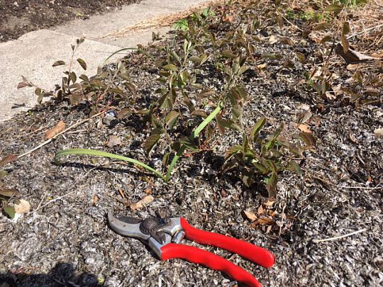 Det gik jeg i gang med. Busken - af sorten Northline - fik jeg fra Villly i foråret 2014, i 2015 høstede jeg en håndfuld bær af busken, som jeg straks såede i en potte, i sommeren 2016 var de spiret til småplanter, som jeg priklede ud i køkkenhaven. Nu er planterne sprunget ud og i god vækst, som man kan se på billedet, og til efteråret regner jeg med at plante hækken.