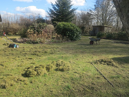 Jeg startede meget tidligt med at vertikalskære, måske også for tidligt sidst i april måned. Plænen blev vertikalskåret på kryds og tværs, revet, topdresset, gødet og eftersået med 15 kg græsfrø på 7-800 kvadratmeter. Der var så godt som bar jord. Efterfølgende fik vi en omgang sne.