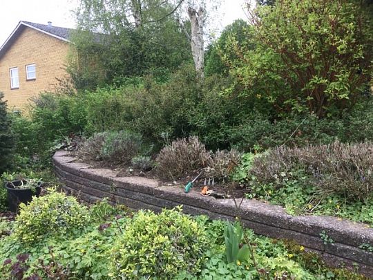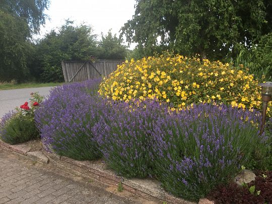 Selvom bedet vender mod nordvest, er det vestligste hjørne meget solrigt og mere bart. Jorden her er mager med meget opfyld af sand. Det østlige hjørne af de 35 m er mere skyggefuldt og jorden federe. Alderen er også nær 30 år, så de har i grunden gjort deres pligt. Jeg må tænke på en erstatning for de østlige lavendler, måske perikon, som bunddække? Helst noget nemt.
