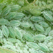 Melet blommebladlus kan sidde ganske tæt på bagsiden af blommeblade her omkring 1. juni. De forsvinder dog hurtigt igen – ofte i forbindelse med regnvejr. Foto: Karna Maj