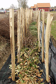 Her er virkelig plads til mange grene – med de kraftige pæle er det også muligt at deponere selv store og tunge grene. Den sorte plast vil kvæle det flerårige ukrudt under hegnet. Hegnet her er set i Den Økologiske Have. Foto: Karna Maj