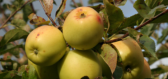De sene æbler vokser stadig og skal først plukkes, når de begynder at slippe. Man forstår bedre navnet Golden Delicious, når man ser de gyldne æbler på træet, end når man ser de helt smagsløse grønne æbler i supermarkedet. Sorten angribes meget let af skurv, men er i år uden ret mange angreb. Foto: Karna Maj