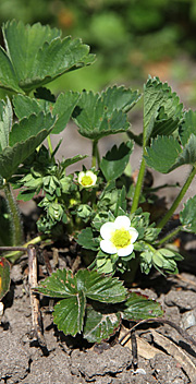 De første jordbærblomster er ved at springe ud – om en god måned er der de dejligste, søde og velsmagende jordbær. Det er noget helt andet end de hårde, smagsløse jordbær, som butikkerne frister os til at købe uden for sæson. Foto: Karna Maj
