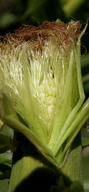 Når silken visner på majskolberne, er det et tegn på, at majskolben er ved at være moden. Men det er ikke altid tilfældet som her, hvor man kan se at kornene endnu er små og lyse. Foto: Karna Maj