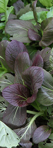 Pak choi kan også fås i en rødbladet udgave – her sorten Amur fra en salatblanding Asia Green fra Sperli Samen, købt hos Frøtorvet. Sorten Sagami fra blandingen er desværre gået i stok her sidst i september som den eneste af 4 pak choi sorter. Foto: Karna Maj