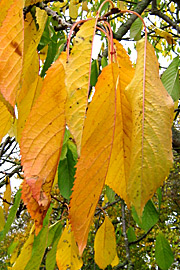 Sødkirsebærtræets store blade hænger gule og kan blæse ned nårsomhelst. Foto: Karna Maj
