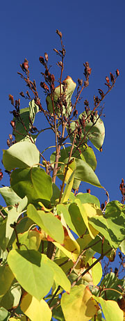 Syrenerne kommer pludselig i fokus, når de får gule blade. De har ellers vokset ret ubemærket, siden vi nød duften og blomsterne i maj måned. Foto: Karna Maj