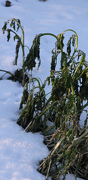 Frosten er langsomt ved at tage livet af en fin bladbede med gule stængler – endnu er der dog liv i plantens yngste blade og midte. Foto: Karna Maj