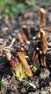 Efterårshindbær klippes ned i det tidlige forår, hvorefter de sætter nye skud, som giver bær i sensommeren. Her er de ny skud på vej op. Foto: Karna Maj