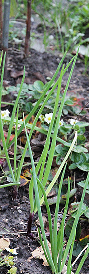 Har man ikke fået høstet forårsløgene i forsommeren, er løgene visnet ned midt på sommeren. Her i efterået kommer de igen og danner ny velsmagende top, som man kan høste af nu eller til forår. Foto: Karna Maj