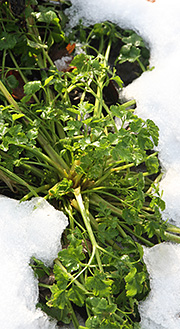 Persillen har klaret vinteren godt indtil nu, og hvis vi kan få mildt vejr fra nu af, vil der hurtigt skyde små nye blade frem. Foto: Karna Maj