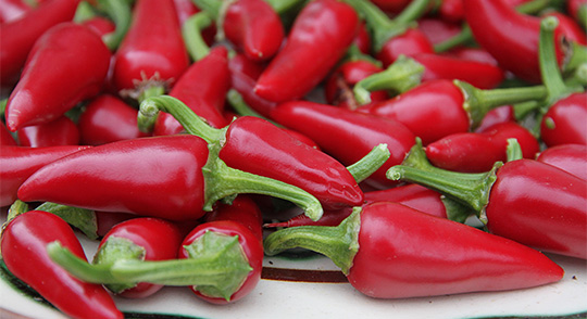 Chilihøst – trods kold start på sommeren blev der en god høst af chili. Og der er flere umodne, som der kan høstes af de næste mange uger. Foto: Karna Maj