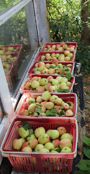 En del af de æbler der allerede er plukket ned, ligger i kasser til senere brug. Men det er en god ide at checke dem for rådne æbler. Som det gamle ordsprog siger, skal der kun et råddent æble til at fordærve hele tønden. Der er ofte et par i en kasse, som udvikler gul monilia og rådner. Det værste er dog, at de smitter alle de æbler, som de rører ved. Desuden udvikler de rådnende æbler ethylen, som får de andre frugter til at modne hurtigere. Det er jo ikke lige det, du gerne vil have, hvis det er æbler, som du havde tænkt dig skulle gemmes til december eller endnu længere.