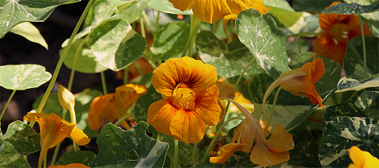 Blomsterkarse, Tropæleum, findes i mange sorter og farver. Der er også nogle med brogede blade. Blomsterkarse kan man godt nå at så direkte endnu. Foto: Heidi Kirk Nissen