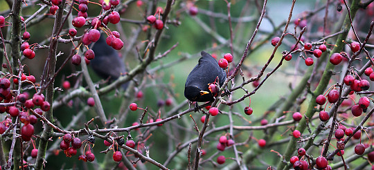 Efter den første nattefrost bliver paradisæblerne sødere i smagen, hvilket lokker solsortene til. Foto: Heidi Kirk Nissen