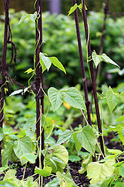 I år er det en stor gevinst at have forkultiverede bønner til udplantning. Her er de udplantede stangbønner allerede i gang med at sno sig op af stativet lavet af jern. Foto: Heidi Kirk Nissen