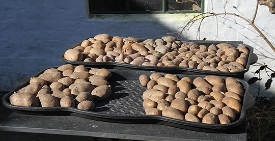 For at få de eftertragtede korte, tykke spirer, skal læggekartoflerne ligge i et enkelt lag. Her er der brugt store skobakker, men alle former for flade kasser, fade med lave sider o.l. kan bruges. Foto: Karna Maj