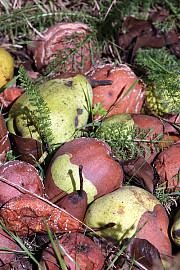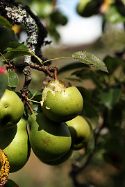 I nogle haver har fuglene den uvane at hakke i de frugter, som endnu hænger på træerne, og de store gedehamse finder også stadig føde i de søde frugter. Foto: Heidi Kirk Nissen