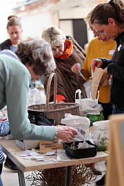 Der er altid livlig aktivitet og snak ved frøbyttebordet på Praktisk Økologis festival. Foto: Heidi Kirk Nissen