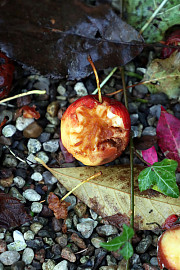 Nedfaldsæblerne skal endelig ikke køres på genbrugspladsen. Fuglene har stor glæde af dem resten af året. Foto: Heidi Kirk Nissen