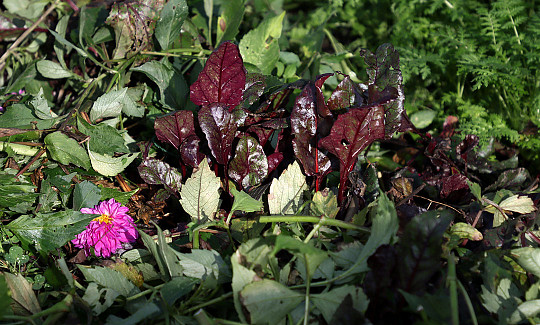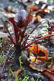 Rødbeder kan man godt lade stå på friland til frisk forbrug helt frem til første periode med dagsfrost, hvis man sørger for at dække dem med et godt lag visne blade – eller som her de afklippede dele af georginerne – som beskyttelse mod efterårets nattefrost. Foto: Heidi Kirk Nissen