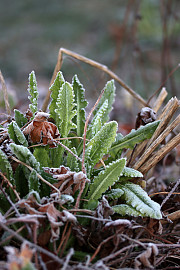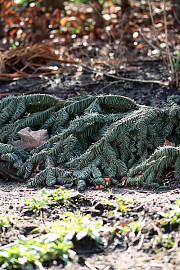 Har man et tykt lag vinterdække liggende i staudebedet over sarte planter, kan man godt fjerne noget af det. Men tag ikke det hele væk. Nattefrost og ikke mindst skarp forårssol kan være hård kost for små, nye skud. Foto: Heidi Kirk Nissen
