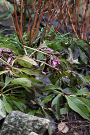 Hvis jorden er tør nok, eller man kan nå ind i bedet fra kanterne, så kan man så småt begynde at rydde nænsomt op i det. Juleroserne her er ikke helt på på toppen efter at have ligget under sne i adskillige uger. Foto: Heidi Kirk Nissen