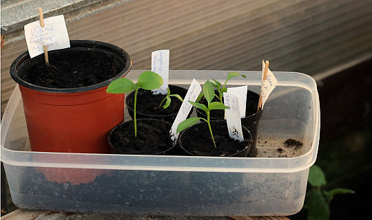 De planter, som skal prikles ud, kan man så i såbakker, og hertil kan man genbruge de dybeste plastikbakker (4–5 cm dybe) fra kød og grønsager. De lave plastikbakker kan bruges til at sætte potterne på i husets vindueskarme.