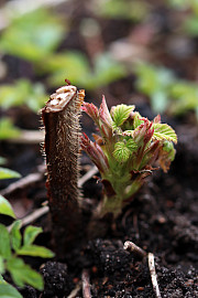 Ser man godt efter, vil man opdage, at knopperne på hindbær er på nippet til at begynde at blive grønne. Det gælder i øvrigt også stikkelsbær og solbær. Og det er jo dejligt, at de allerede er på vej til at springe ud, så haven snart kan få et grønt skær.