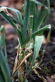 Man kan være heldig, at der stadig er lidt vinterporrer i fin kvalitet ude i haven. Nogle gange ser de lidt ynkelige ud, men der kan gemme sig noget godt, hvis man fjerner de yderste lag blade. Foto: Heidi Kirk Nissen