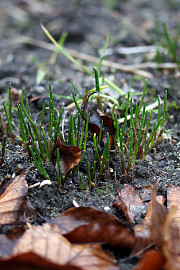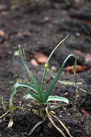 Hvis man har sået små topløg af slangehvidløg, er de på vej op nu. Men de er små i forhold til de hvidløgsplanter, som er skudt op fra satte fed. Topløgene giver kun et lille løg i år, som kan bruges til sætteløg. Det er en nem måde at opformere hvidløg på, hvis de er af en type, som sætter topløg.