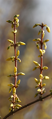 Forsythia er i mange haver, hvor den lyser op med de gule blomsterknopper, der er lige på nippet til at springe ud. Den kan også bruges som en klippet hæk, der skiller sig ud her i april fra alle de grønne eller bladløse grå hække. Foto: Heidi Kirk Nissen