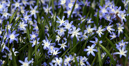 Selvom der kan være rimfrost om morgenen, så skal forårsblomsterne nok klare sig. Her er det et hav af blå snepryd, der vitterligt pryder bunden af staudebedet. Foto: Heidi Kirk Nissen