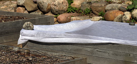Det er nemmest bare at lægge fiberdugen fladt over bedet og holde det nede med et par gamle fliser, sten e.l. Men kommer der frost, kan bladene, der rører dugen, få frostskader, så der kan det være en god idé at hæve dugen op på buer. Foto: Heidi Kirk Nissen