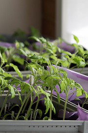 Tomatplanter kan godt sås tæt, men når de begynder at vokse for alvor, kræver de jævnlig ompotning for at fortsætte den gode vækst. Foto: Heidi Kirk Nissen