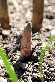 Har man investeret i et godt aspargesbed, kan der også hentes de første asparges fra egne rækker, og de er noget mere saftspændte og friske end de udenlandske i supermarkedet.