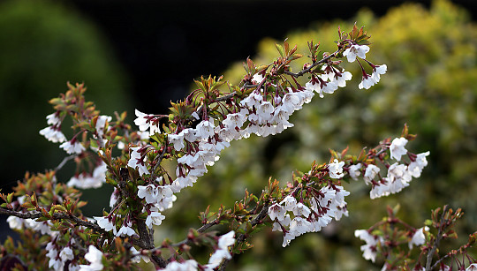 De japanske prydkirsebærtræer er begyndt at springe ud. Dette er en lille variant, men et af forårets største blomstershows er, når de lyserøde sorter blomstrer. Foto: Heidi Kirk Nissen
