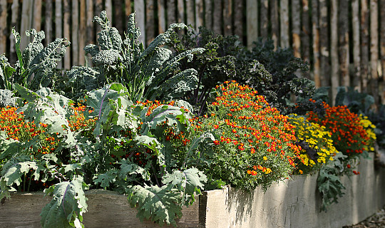 Sommerblomster pynter også mellem køkkenhavens mange grønne rækker. Foto: Heidi Kirk Nissen