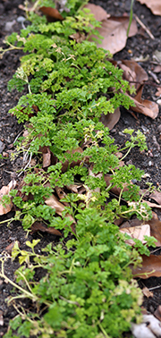 Lidt frisk persille fra sidste års planter. Denne række står i halvskygge. Mere solrigt placerede rækker er længere fremme. Foto: Heidi Kirk Nissen