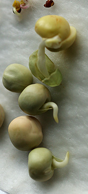 Det er en tilfredsstillende spiring, når tre ud af fem ærter spirer samtidig i en spiretest. Endnu bedre havde det været, hvis fire eller alle fem spirede. Foto: Karna Maj