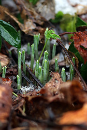 Vintergækkerne står allerede med grågrønne skudspidser, og nogle har ligefrem synlige hvide blomsterspidser. De kan graves op i blokke og drives frem. Husk at lave en nænsom overgang gennem kølige rum eller drivhus til det varme og tørre indeklima.