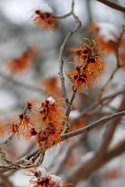 De første buske og træer har trodset kulden og er begyndt at blomstre. Her er det troldnød, der fås i forskellige gule, orange og rødlige sorter. Mange af dem har også flotte høstfarver. Foto: Heidi Kirk Nissen