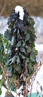 De hårdføre vintersorter af kål har klarede det pænt i lang tid, men nu hænger bladene på de fleste. Nogle tynges også af sneen. Så er det en god idé at ryste dem blidt, så sneen falder af. Foto: Heidi Kirk Nissen