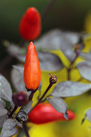 Chili fås i et utal af sorter, og mange af dem er ganske dekorative og fortjener en fremtrædende plads i drivhuset eller haven. Her er det sorten »Christmas« med mørkt løv og frugter, der modner fra lilla til rød. Foto: Heidi Kirk Nissen
