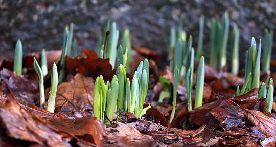 Sneen smelter og under den står forårsblomsterne klar. Gule erantis og hvide vintergækker er på vej op, og tidlige påskeklokker kan man også finde med store knopper. Blokke af krokus står og strutter med friskgrønne blade lige op i luften, og på billedet kan man se, hvordan påskeliljerne også voksede under sneen. Foto: Heidi Kirk Nissen