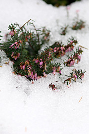Efterhånden som sneen smelter, er det skønt at se, hvor mange af planterne, der egentlig har klaret sig godt – som her, hvor lyngen titter frem.