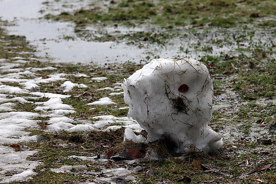 Sneen og snemanden er smeltet, og nu er der i stedet begyndt at danne sig en lavvandet sø på plænen. Vandet skal nok sive væk, men det kan stå lidt tid, hvor jorden er meget tung, eller hvor den har været frossen i dybden. Foto: Heidi Kirk Nissen