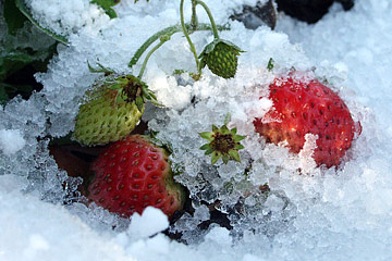 Jeg glemte lige at høste jordbærene. Men de smager nu heller ikke af meget i oktober. Så dette syn, der symboliserer mødet mellem sommer- og vinterhalvår er det værd. Foto: Karna Maj