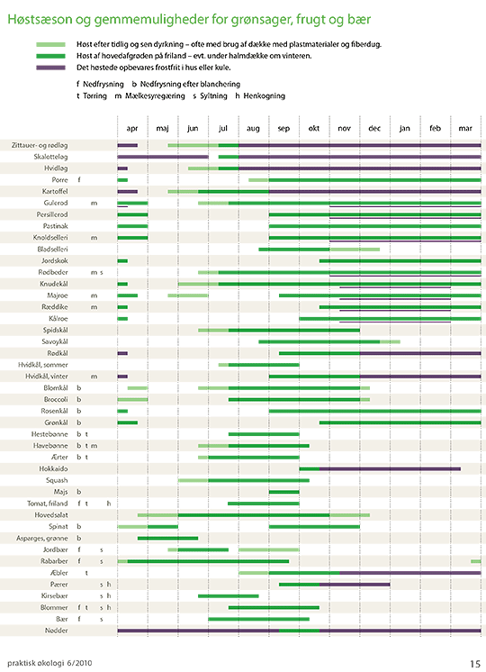 Skemaet nedenfor er udarbejdet til vores tidsskrift Praktisk Økologi. Det er meget detaljeret med høsttidspunkt både for hovedafgrøden og for tidlige og sene afgrøder, hvor der bruges forkultivering og drivning i ydersæsonerne. Når det gælder opbevaring, er der i skemaet oplysninger om forskellige typer af opbevaringsmetoder, og hvor længe afgrøderne kan opbevares.